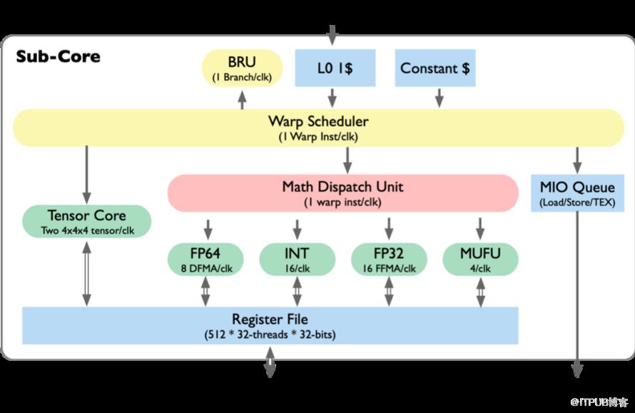 因此,在Volta架构中,SubCore微架构单独提供了一个TensorCore的指令,直接提供给Warp Scheduler使用,无需通过Math Dispatch Unit进行指令分发。