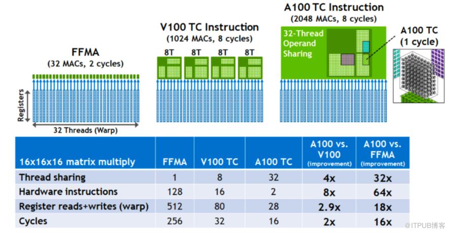 在V100中,每个Tensor Core可以处理8个线程,每个线程拥有自己的寄存器。因此,在8个时钟周期内,可以执行1024次MAC操作。而在A100的Tensor Core中,每个Tensor Core可以处理32条线程,因此在8个时钟周期内,可以寄存2048次MAC操作,每个时钟周期处理其中一块的数据。