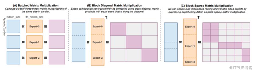 与此同时,Megablocks(2022年11月)则专注于通过开发新型的GPU kernel,高效处理MoE模型中的动态性,以实现更高效的稀疏预训练。其核心优势在于能够充分利用每个令牌的信息,并高效地适应现代硬件架构(特别是支持块稀疏矩阵乘的架构),从而达到显著的加速效果。Megablocks的创新之处在于,它摒弃了传统MoE使用批量矩阵乘法的做法(这种做法通常假设所有专家形状相同且处理相同数量的令牌),而是将MoE层表示为块稀疏操作,能够灵活适应不均衡的令牌分配,从而进一步提升了模型的训练效率和性能。