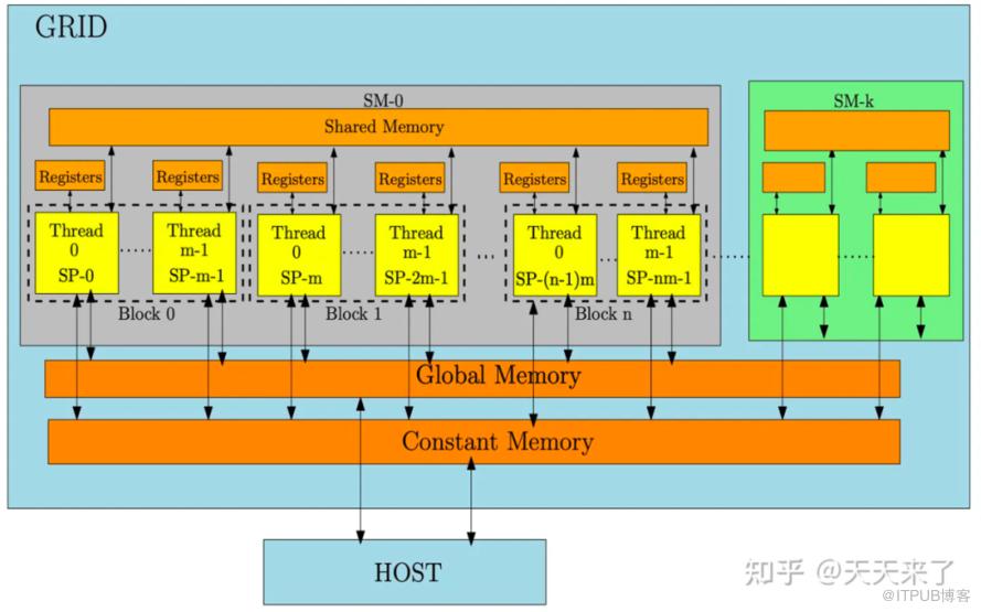 从上图可以看出,一个Grid可以包括多个SM,也可以访问Global Memory和Constant Memory;