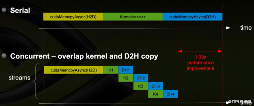 通过在不同的Stream里同时分别执行kernel调用及数据传输,使数据传输与运算并行。(注意default stream的坑)