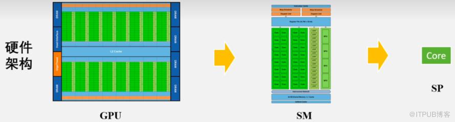 从硬件上来看,CUDA编程模型中的网格、线程块和线程大致与硬件结构中的GPU、SM(流式多处理器)和SP(流式处理器)是一一对应的。