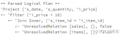 以下是从 sql 语句中解析出的未解析的逻辑计划。对于我们的 sql 示例来说,我们可以看到,“sales”表和“items”表都是未解析,列名称未经验证,并且列上没有类型信息。