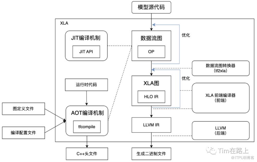 XLA主要由数据流图转换器、XLA编译器、JIT(just-in-time)编译机制、AOT(ahead-of-time)编译机制等模块构成。