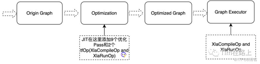 如上图所示,原始的TensorFlow图会通过图优化规则以及TFOp来接入JIT XLA编译的,下面我们展开细说下这里的执行过程。