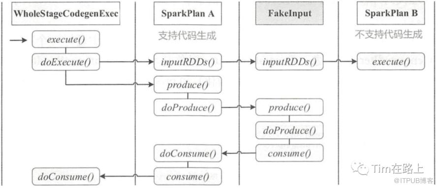 每一个Exec中都有doExecutor()方法,在执行时会按照流程进行依次的迭代计算,数据会在每个算子间进行流转。而代码生成则是在执行前先基于inputRDDs接口直接从叶子节点获取数据,然后基于doProduce、doConsume捏合成的“手写”代码进行一次调用。