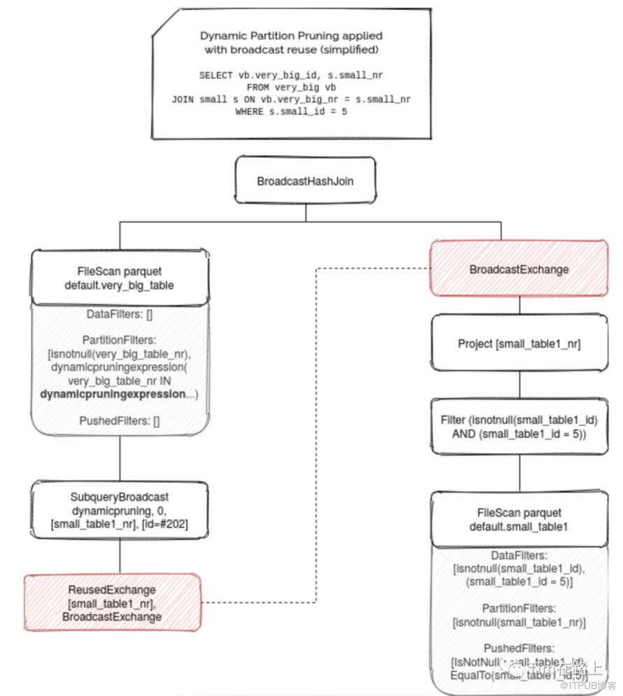 [1] 如果当前开启了exchangeReuseEnabled,同时Plan中存在BroadcastHashJoinExec,则会重用当前的BroadcastExchangeExec,并将其封装为一个InSubqueryExec,最后再包装为DynamicPruningExpression表达式。其类似于下面的场景: