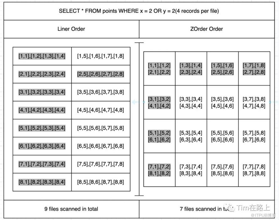 在上面的图片中,每个数据框代表一个文件,每个文件均匀存放4个数据,左边是线性排序后的数据分布,右边是Zorder排序。从中可以看出在查询x = 2 or y = 2的条件时,线性排序需要扫描9个文件,zorder排序只需要扫描7个文件。