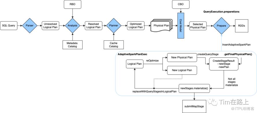 最后我们总结下一条SQL在开启AQE后是如何被优化的,如下图所示: