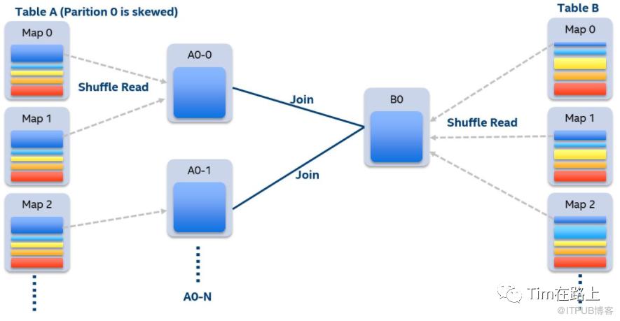 假设表 A 和表 B 执行内连接并且表 A 中的分区 0 是倾斜的。对于正常执行,表 A 和 B 的分区 0 都被洗牌到单个 reducer 进行处理。由于这个 reducer 需要通过网络和进程获取大量数据,因此它可能是延长整个阶段时间的最慢任务。