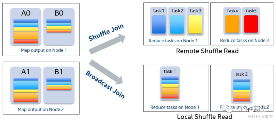举个例子:假设 shuffle 分区数为 5。在 map 阶段,任一连接都包含 2 个 map 任务。在 reduce 阶段,为 SortMergeJoin 启动了 5 个 reducer,每个 reducer 进行远程 shuffle 读取。但是,如果将 BroadcastHashJoin 转换为,则只需要启动 2 个 reducer,并且每个 reducer 在本地读取一个 mapper 的完整 shuffle 输出。