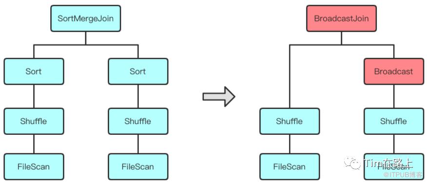 只要有任意一张表的统计信息满足这两个条件,Shuffle Sort Merge Join 就会降级为 Broadcast Hash Join。