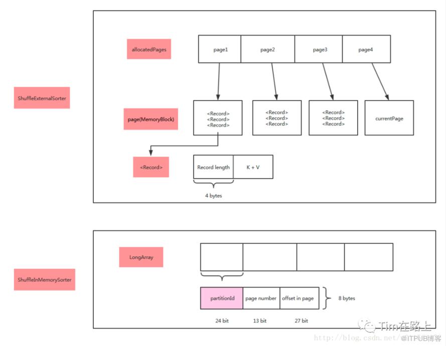 其次在ShuffleExternalSorter中定义了ShuffleInMemorySorter,它主要用于存储数据的partitionId和recordAddress, 另外定义了MemoryBlock页空间数组。