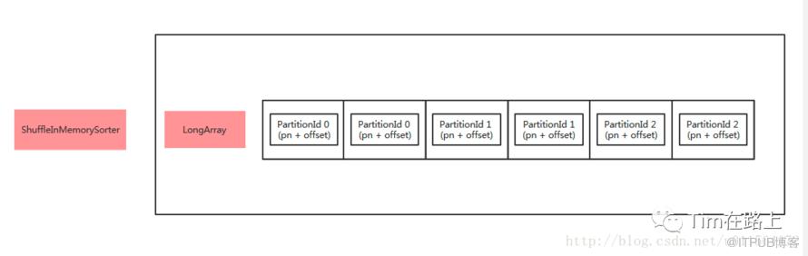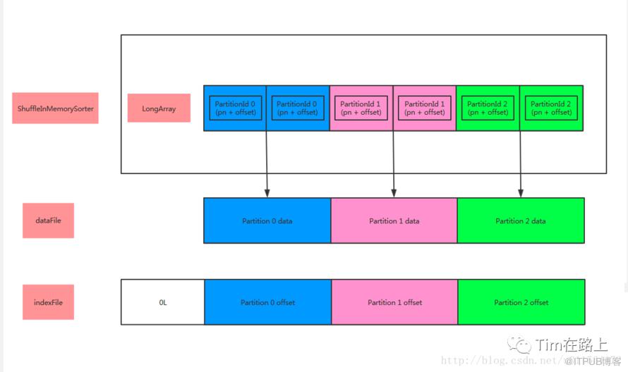 首先是通过ShuffleInMemorySorter排序,获取对应分区的FileSegment和长度。写文件或溢写前根据数据的PartitionId信息,使用TimSort对ShuffleInMemorySorter的long数组排序,排序的结果为,PartitionId相同的聚集在一起,且PartitionId较小的排在前面,然后按分区写出FileSegment, 并记录每个分区的长度。