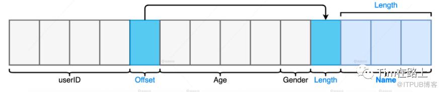 从上面可以看出每个数据元组,有三部分组成[null bit set] [values] [variable length portion],null的追踪和word边界的补齐是由bitSetWidthInBytes字段负责。从上面的例子可以看出在赋值Long时调用Platform.putLong直接进行赋值。但是如果插入的数据是可变的数据类型,会先插入offset偏移量,指定在定长插入完成的靠后的位置,然后再插入其长度,最后再插入其数据值。
