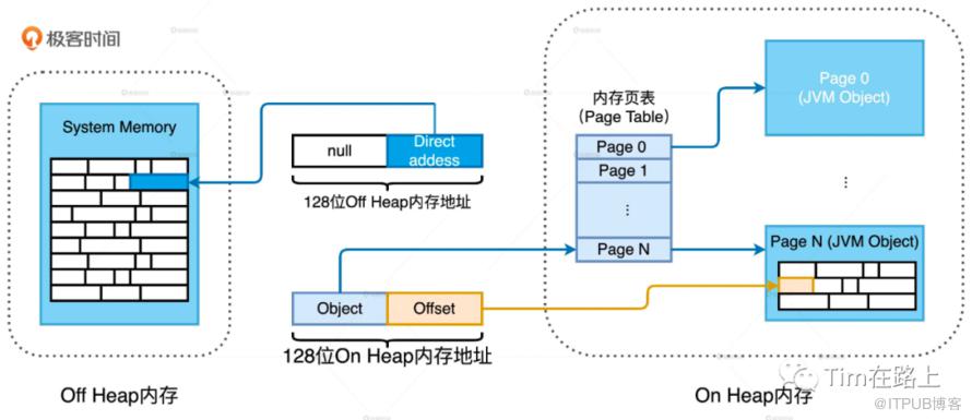 对于 On Heap 空间的 Tungsten 地址来说,前 64 位存储的是 JVM 堆内对象的引用或者说指针,后 64 位 Offset 存储的是数据在该对象内的偏移地址。而 Off Heap 空间则完全不同,在堆外的空间中,由于 Spark 是通过 Java Unsafe API 直接管理操作系统内存,不存在内存对象的概念,因此前 64 位存储的是 null 值,后 64 位则用于在堆外空间中直接寻址操作系统的内存空间。