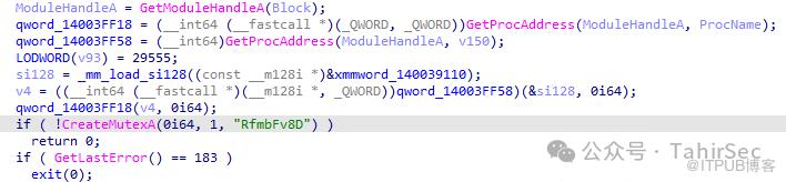 最终加载的解密后的shellcode为BADNEWS类型远控木马,样本首先创建互斥变量“RfmbFv8D”,避免因计划任务同时存在多个恶意进程。