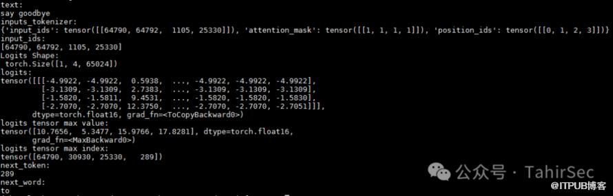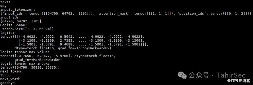 以ChatGLM3为例,输入一个词say,经过模型最终预测出下一个词为goodbye。具体预测过程下面分步进行解释。
