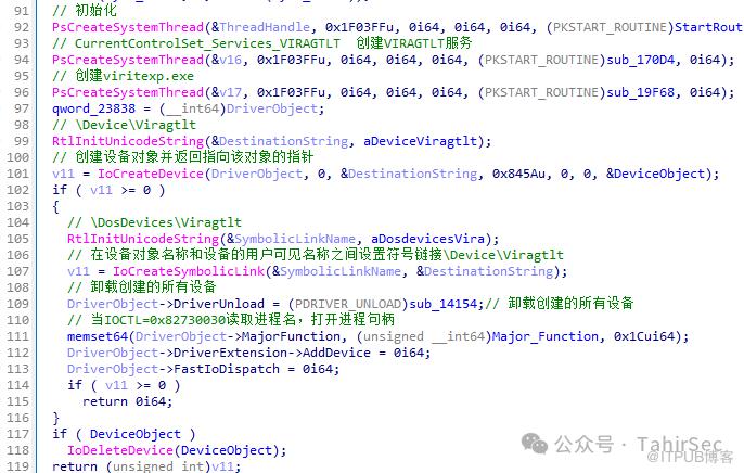 CreateFileA("\\\\.\\Viragtlt", GENERIC_WRITE|GENERIC_READ, 0, NULL, OPEN_EXISTING, FILE_ATTRIBUTE_NORMAL, NULL);向目标设备的发送 IOCTLDeviceIoControl,终止进程。