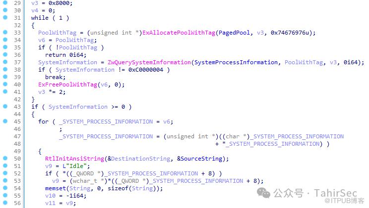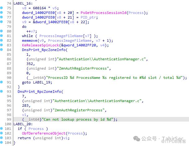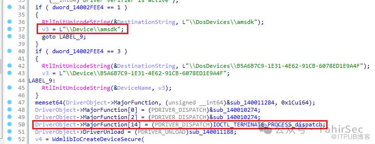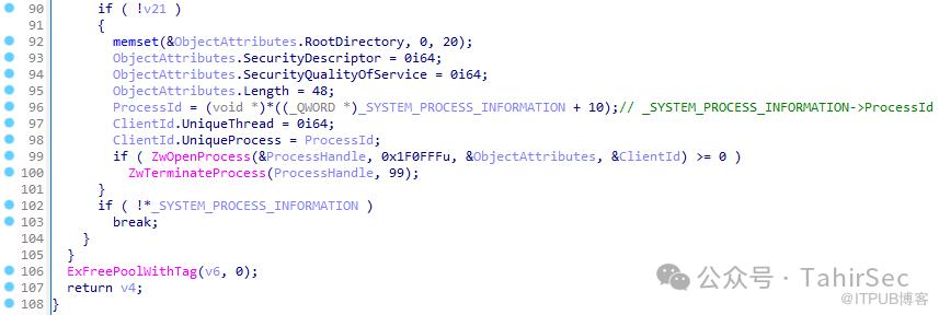 反编译amsdk.sys查找引用ZwTerminateProcess()的函数,ZwOpenProcess()将进程句柄作为参数传递给 ZwTerminateProcess()。