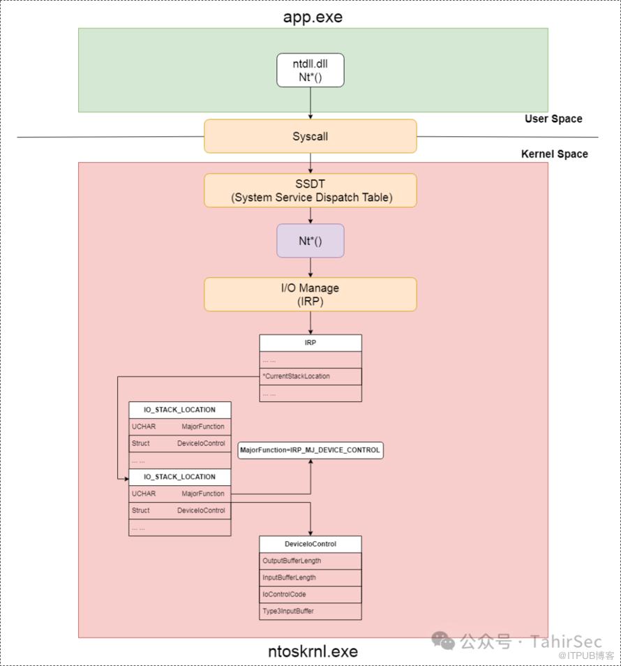I/O管理器(I/O Manager)目的是创建I/O 请求数据包 (IRP)数据结构,将包含用户态进程调用信息的IRP发送到相关的内核驱动程序(app.sys)。