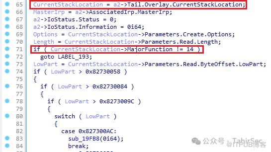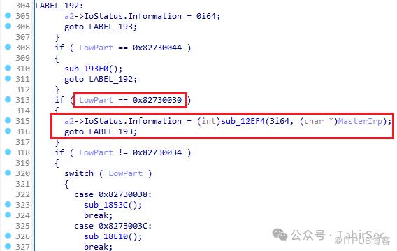 然后,驱动程序使用IRP当前IO_STACK_LOCATION字段找出需要执行哪个MajorFunction。如果MajorFunction字段的内容为IRP_MJ_DEVICE_CONTROL ,则将在DeviceIoControl字段中检索IoControlCode代码。