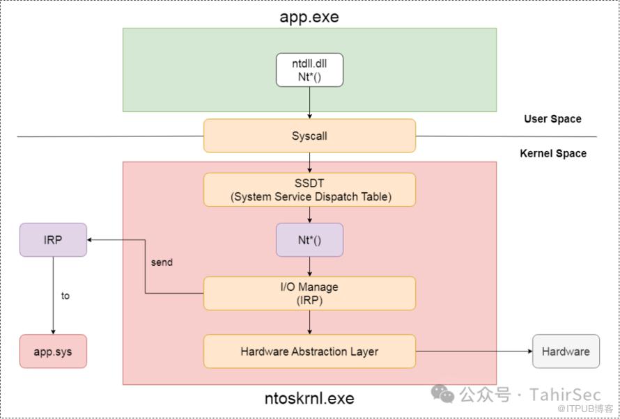 用户态进程(app.exe)调用ntdll.dll的Nt*() Windows API 函数,通过系统服务描述符表找到 对应的内核 Nt*() API 函数地址。