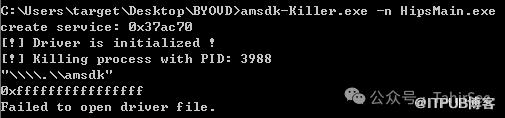 CreateFileA("\\\\.\\amsdk", GENERIC_WRITE|GENERIC_READ, 0, NULL, OPEN_EXISTING, FILE_ATTRIBUTE_NORMAL, NULL);并使用我们的目标的发送 IOCTLDeviceIoControl,先注册认证进程,绕过进程校验,然后调用终止进程。