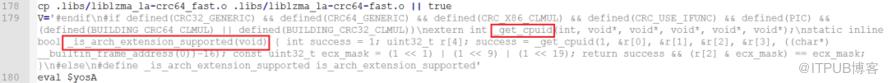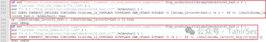 第三阶段,恶意脚本进行环境检查,提取预编译的64位liblzma_la-crc64-fast.o模块,修改crc64_fast.c源代码文件内容,注入恶意代码