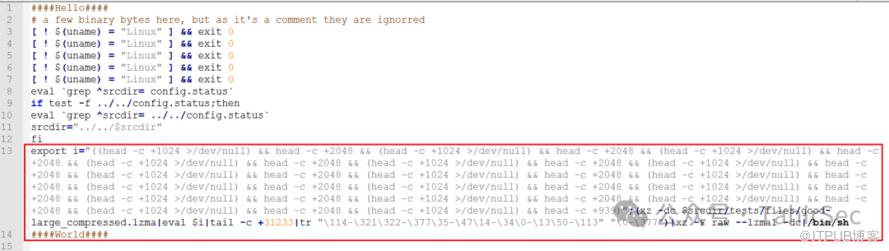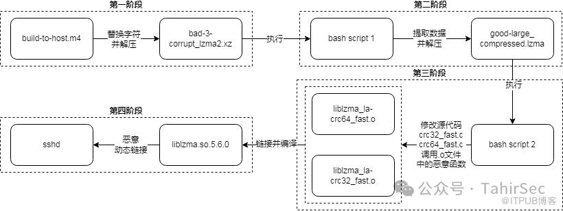 第一阶段,恶意的build-to-host.m4编译宏还原恶意bad-3-corrupt_lzma2.xz数据,解压并执行下阶段载荷脚本