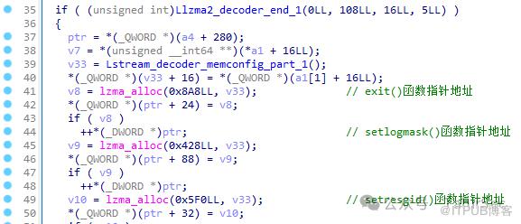 lzma_alloc()用来查找符号而不是分配,字符串 ID作为大小来查找函数指针,并且lzma_free()在释放时不执行任何操作。对于这个假分配器,其中某个成员指向内部 ELF 模块描述符记录。
