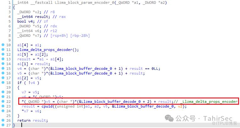 分析Llzma_block_param_encoder_0()函数,发现可疑的Llzma_block_buffer_decode_0指针。