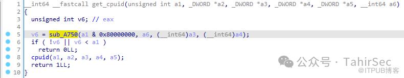 分析恶意liblzma_la-crc64-fast.o目标文件的导出_get_cpuid()函数,调用sub_A750()函数。