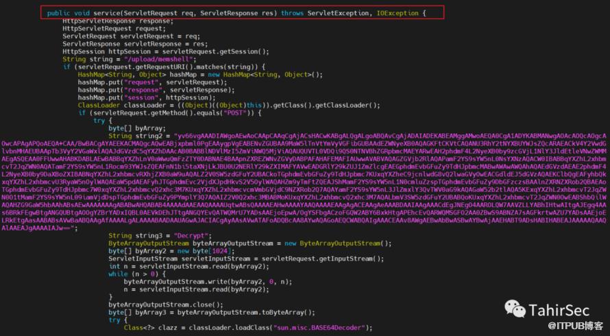 发现在javax.servlet.http.HttpServlet类的service方法中,被注入了 内存马