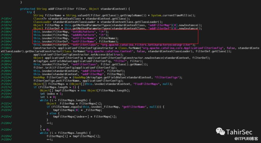 添加一个过滤器,拦截的uri路径"/*",并将过滤器配置和过滤器映射添加到Context标准上下文中,然后对过滤器进行排序,确保为最高的优先级,最先触发此过滤器