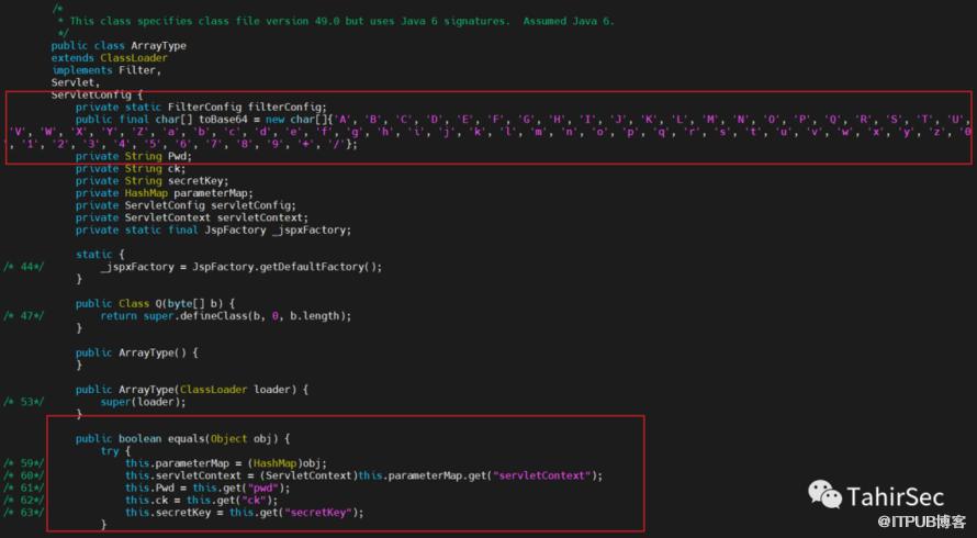 其中base64解码后为class文件,class文件反编译后的源码为Behinder webshell(最终实现功能的内存马)