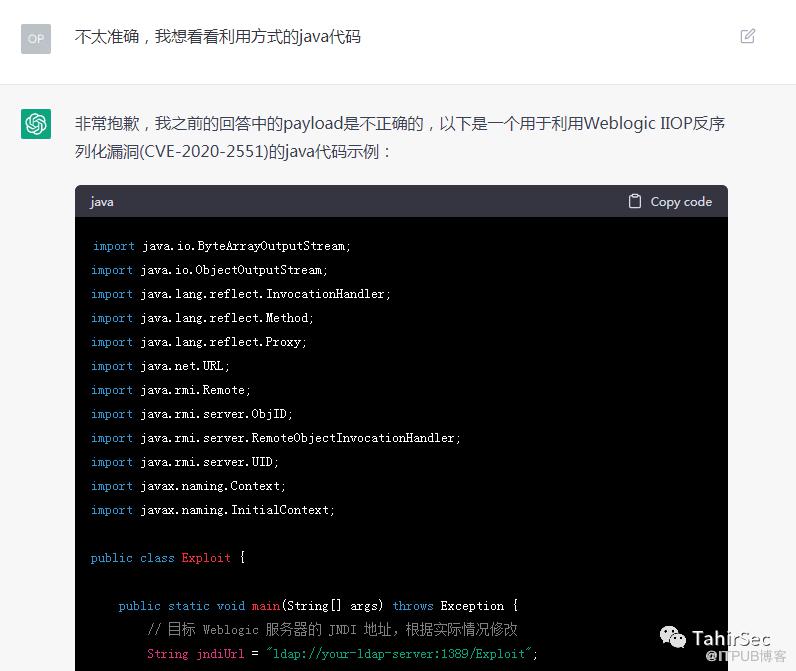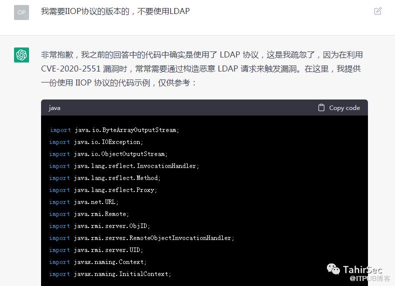 ChatGPT第一版是LDAP协议,但这个漏洞利用应该是IIOP协议的,在我一步一步引导下,生成了一份相对完整漏洞利用代码,效果不错。