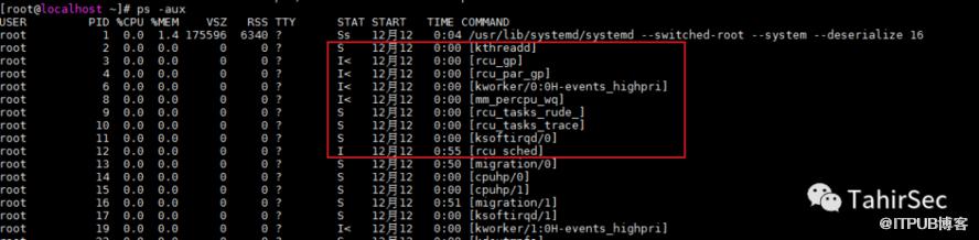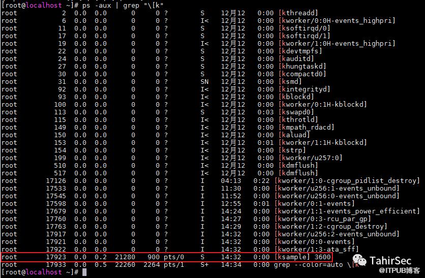 有些恶意软件使进程的名称周围显示 [xxx] ,伪装成 Linux 内核线程来隐藏其运行时的状态。比如,设置可执行文件名称为 [ksample],然后伪装为内核线程运行。
