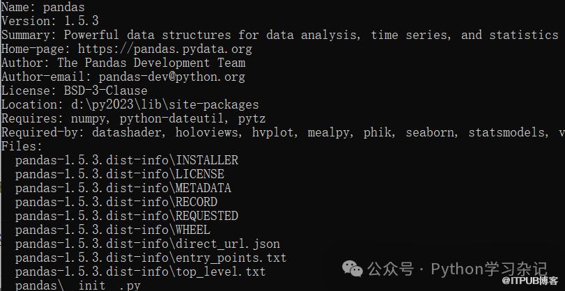 该信息显示了pandas的版本,包的安装地址、官方文档地址等详细信息。