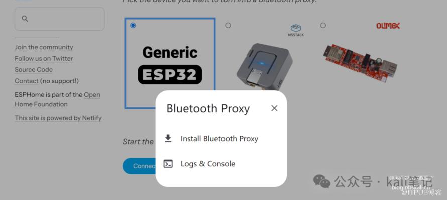 现在,我们需要给esp32刷入固件。打开网站 https://esphome.io/projects/?type=bluetooth 连接设备。