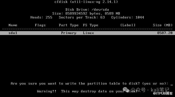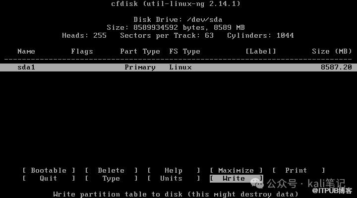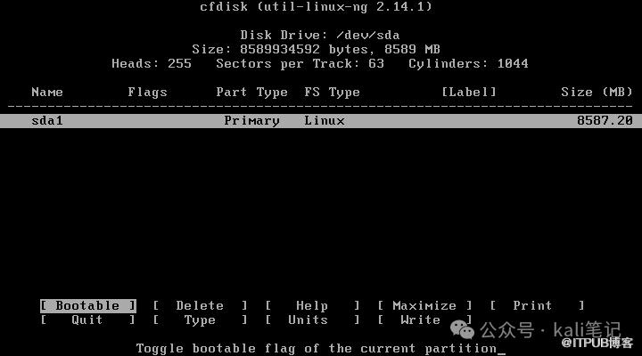 激活分区,写磁盘引导信息,选择“Bootable”然后回车,“sda1”的Flags就是“Boot”。