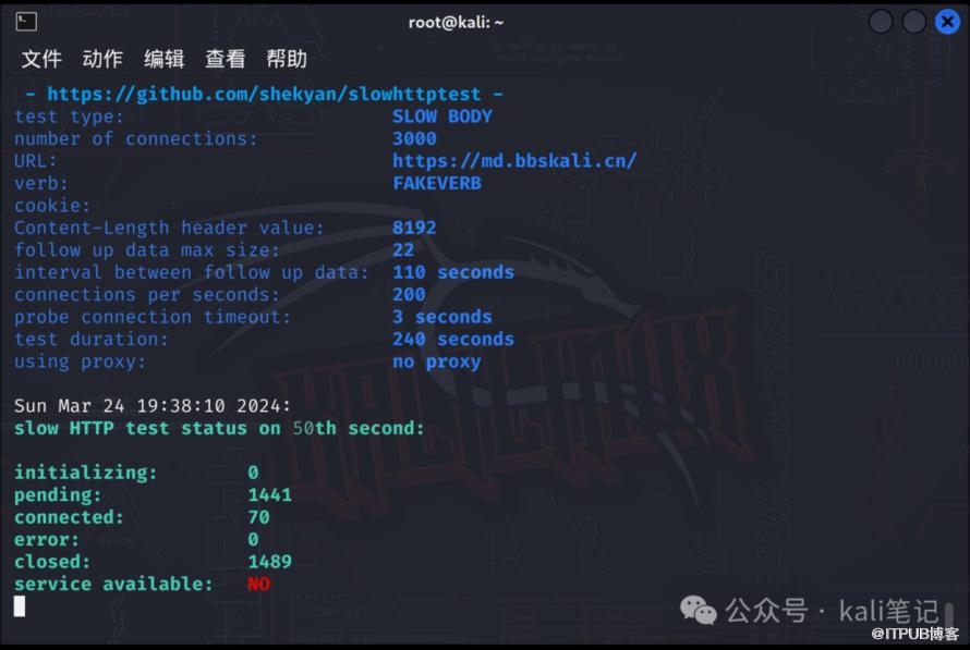 slowhttptest -c 3000 -B -g -o my_body_stats -i 110 -r 200 -s 8192 -t FAKEVERB -u "https://md.bbskali.cn" -x 10 -p 3
