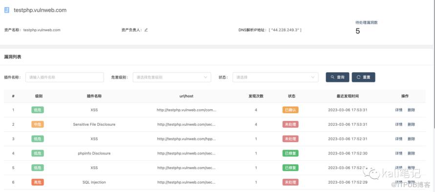 点击详情可以看见漏洞详情、插件基本详情及处理历史。