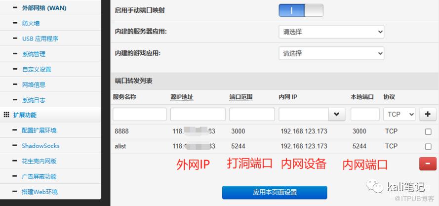 上一步完成后,我们还无法访问。因为没有指定内网设备的IP和端口。因此我们需要在路由器中进行端口转发。