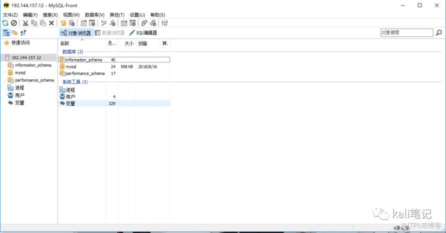 MySql-Front小巧的管理Mysql的应用程序.主要特性包括多文档界面,语法突出,拖拽方式的数据库和表格,可编辑/可增加/删除的域,可编辑/可插入/删除的记录,可显示的成员,可执行的SQL 脚本,提供与外程序接口,保存数据到CSV文件等.