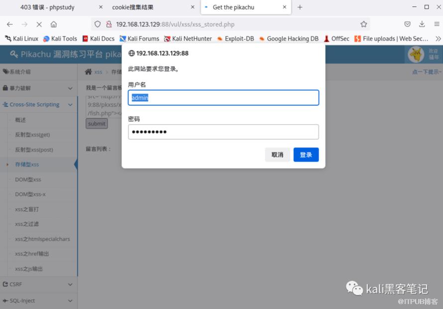 相对于前者而言。这种xss是危害最大的。他会将恶意代码存放在数据库中。从而任何人登录,都会弹窗对应的js代码。payload