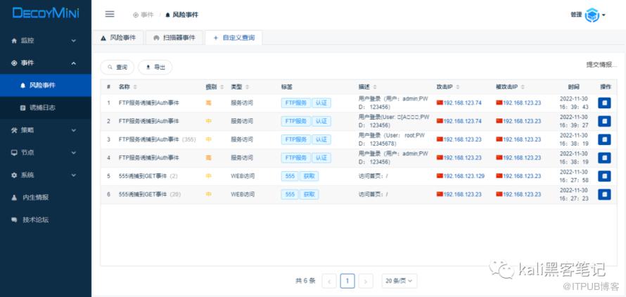 成功得到密码为123456 尝试登录系统后,我们的蜜罐系统中就会有相应的攻击信息。