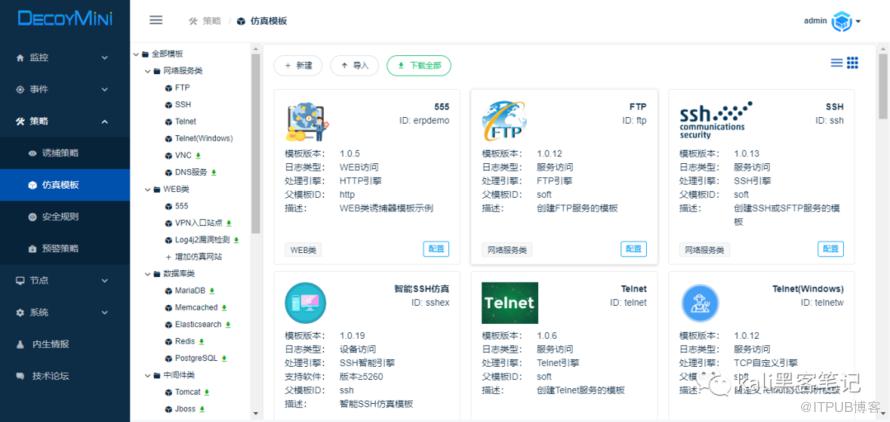 同理,我们只需要自己的需要搭建蜜罐环境就行了。点击仿真模板里面含有多种漏洞平台,我们只需将其下载后,配置相关的参数即可!